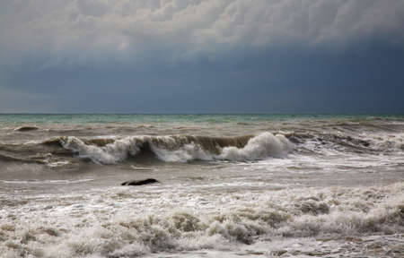 View of a stormy sea and dramatic cloudy sky, big waves are crashing on the shore