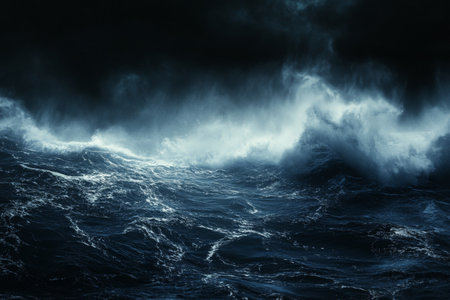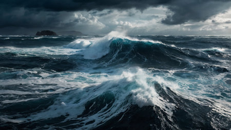 Turbulent sea waves rise and fall under dark clouds, creating a dramatic atmosphere in the ocean.