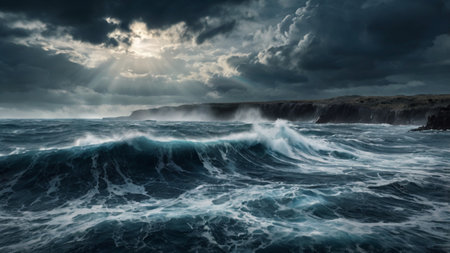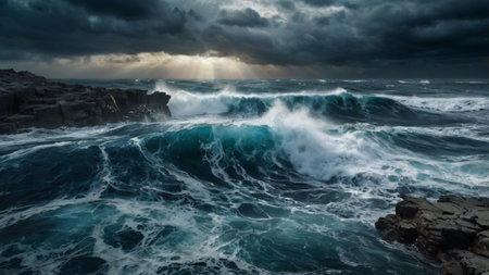 A powerful ocean storm with dark, towering clouds, crashing waves, and rays of light piercing through, evoking a sense of awe and the raw power of nature during a tumultuous weather event. AI generated image