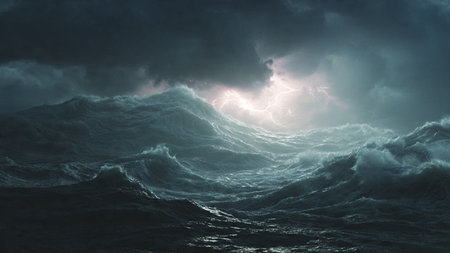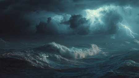 A powerful storm brews over the ocean as lightning strikes in the distance. Dark clouds swirl menacingly above crashing waves, creating a breathtaking and intense atmosphere.
