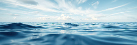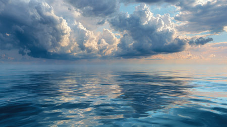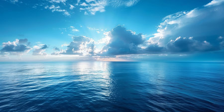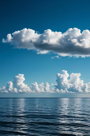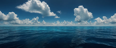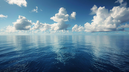 serene ocean landscape, clear blue sky with fluffy clouds, calm water surface reflecting the sky, perfect for relaxation and tranquility Ideal for nature and travel themes