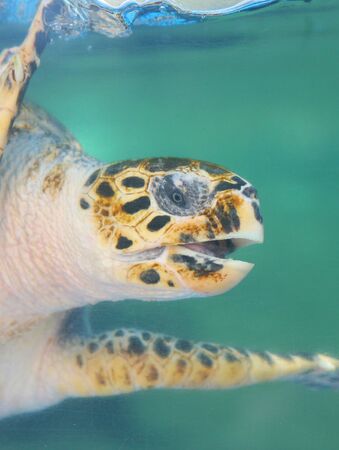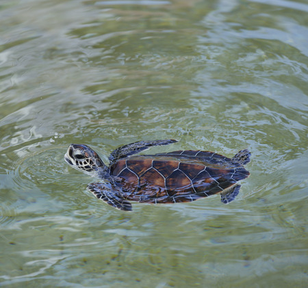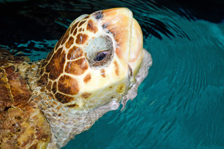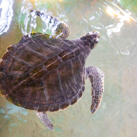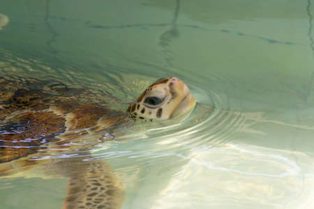 Close up. Sea turtle swimming in the pond, raise its heads above the water.