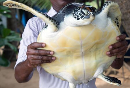 Man's hand holding Green Sea Turtle Close-up Farm and Hatchery in Sri Lanka.