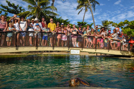 Praia do Forte, Brazil - 31 January 2019: people observing turtles on Project Tamar tank at Praia do Forte in Brazil
