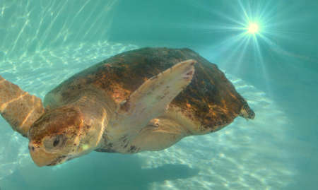 Big sea turtle Kareta flowing in a sea water in Japan