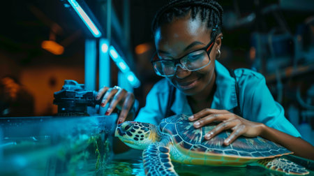marine biology research, an african-american female marine biologist attentively studies a rescued sea turtle in a research facility with tanks and marine equipment under bright lighting