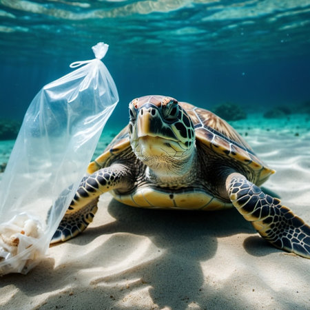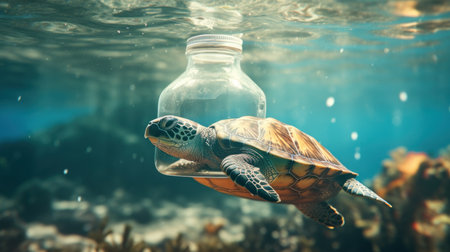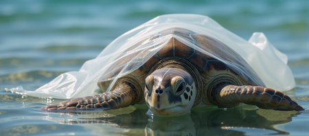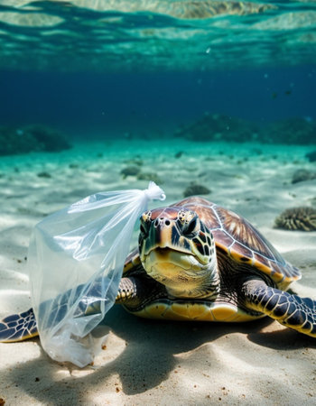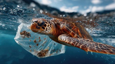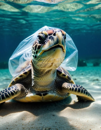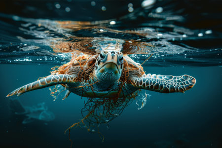 A breathtaking image of a sea turtle swimming gracefully through the ocean, entangled with a plastic bag. This powerful visual emphasizes the urgent need for marine conservation and highlights the impact of pollution on aquatic life.