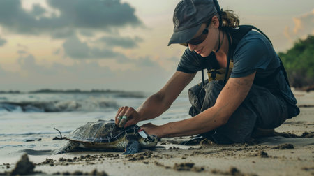 A biologist tagging turtles on a beach to study their migration patterns