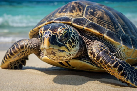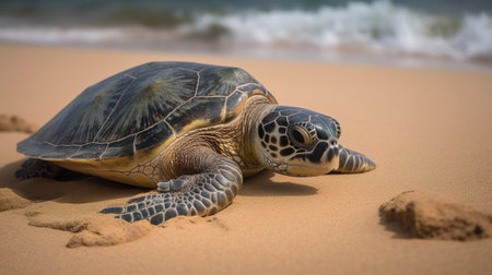A captivating shot of a sea turtle emerging from the waves onto the beach, droplets of water glistening on its shell as it prepares to lay eggs in a safe spot.