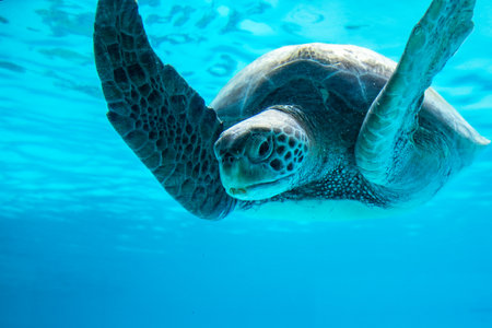 sea turtle swimming in blue seas and sky