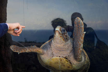 People look at and point towards a big turtle in an aquarium. Caged wildlife concept.