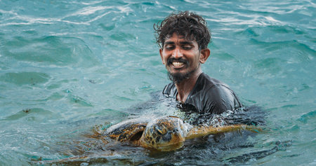 Happy Man with Sea Turtle in Ocean Portrait Sri Lanka
