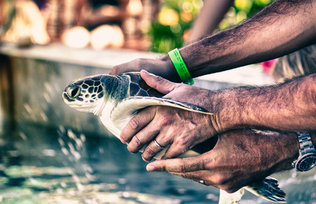 Release sea turtles after rehabilitation Concept of protecting nature and preserving animal species.
