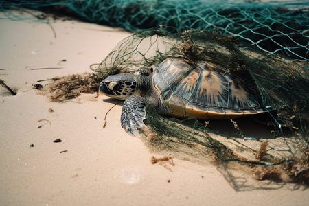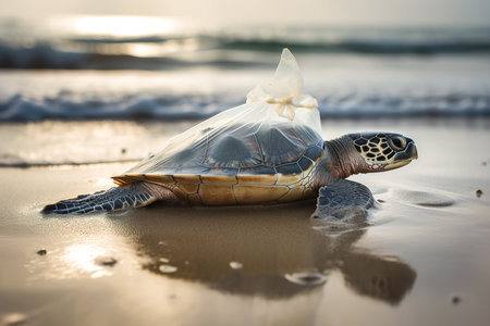 Sea turtle is caught in plastic bag on sandy beach near ocean. Its body is lying on sand. Image highlights dangers of plastic pollution in ocean and need for environmental protection. AI generated