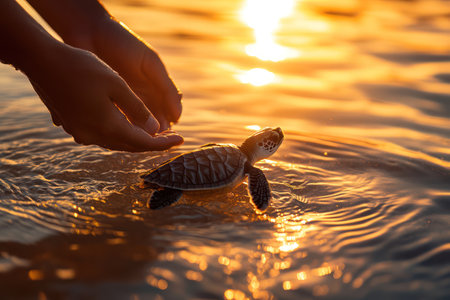 Hands gently set baby turtle free into golden sunset water, capturing themes of conservation, hope, and natural life cycles.