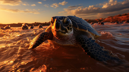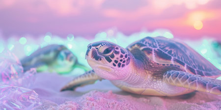 Sea turtles on dreamy beach at sunset ambient glow.