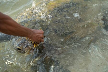 Man feeding turtles in the adoptation center on Bali island.