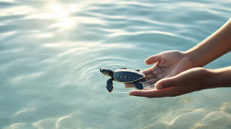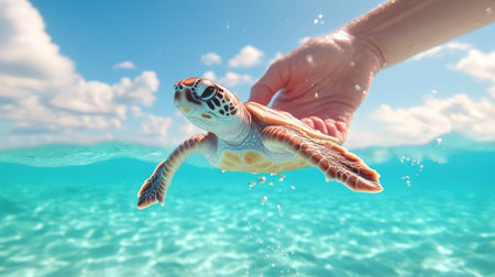 Baby sea turtle swimming in crystal clear turquoise water near open hand, creating a peaceful and eco conscious scene promoting marine life conservation and sustainability