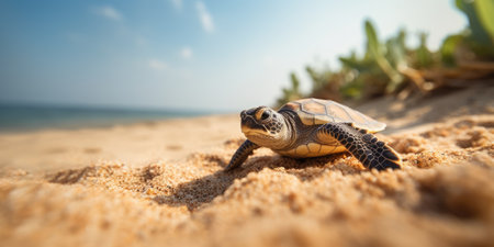 A baby sea turtle on tropical sand beach. AI generated.