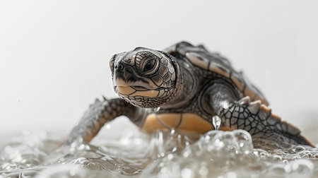 A close-up of a beautiful baby sea turtle with a unique shell pattern crawling on a white background. The intricate details and water droplets add to its natural beauty.