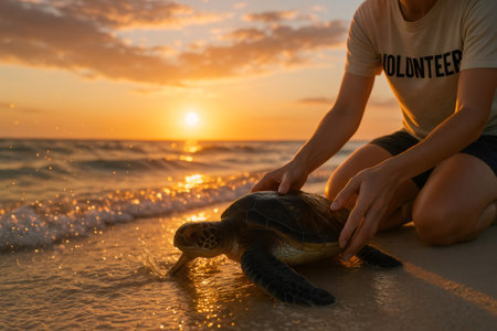 Volunteer releasing baby sea turtle into the ocean at sunset, promoting wildlife conservation and environmental protection