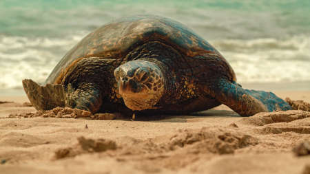 Hawaiian green sea turtle, Turtle Bay, Hawaii A green sea turtle in beach to lay eggs Oahu, Hawaii