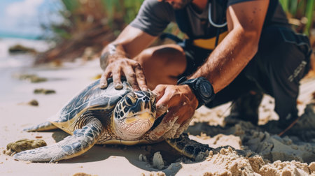 Man is gently handling sea turtle on sandy beach under sunny skies