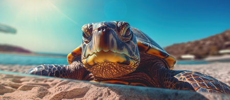 A turtle tourist enjoys a vacation on the beach. Exotic wildlife animal. Travel agency advertising concept.