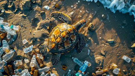 An AI generated illustration of A close-up image of a turtle lying on its side on a sandy beach littered with plastic debris