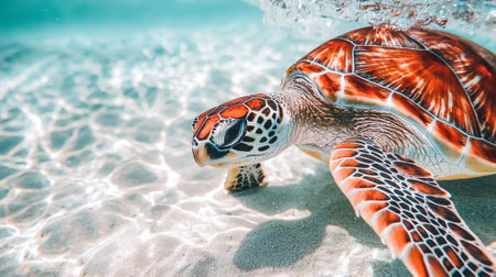 A sea turtle gracefully swims through clear water, illuminated by sunlight from above. The image showcases a textured aquatic environment with a focus on the turtle's form and color. This scene evokes a sense of serenity and can be used for various projects that require imagery related to marine life and conservation.
