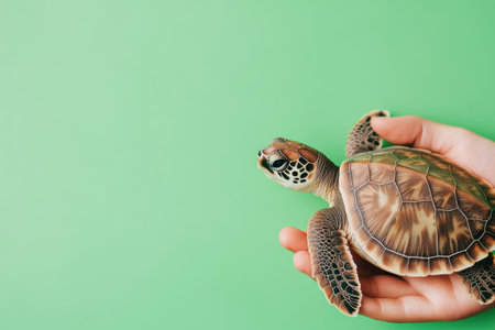 Hand holding a young sea turtle against a soft green background for conservation awareness.