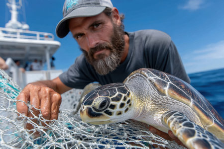 Workers engage in sustainable fishing practices while protecting marine wildlife. A sea turtle rests atop a stack of fishing nets, showcasing the harmony between conservation and local fishing.
