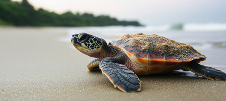Newborn sea turtle crawling on a sandy beach towards the ocean waves