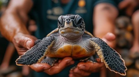 Gentle hands of a conservationist support a baby loggerhead sea turtle, moments before its release into the ocean, symbolizing hope and environmental protection