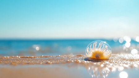 Golden sunlight glimmers on a beach where a unique spiny seashell emerges from a bed of pebbles, capturing the beauty of coastal life as tiny droplets dance in the warm breeze.