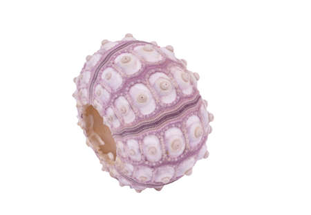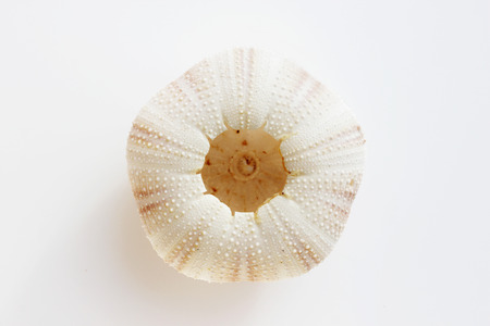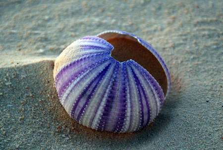Detailed and detailed structure of a sea urchin with seashell inside on the beach in the sun bright and warm colored decorative and ornamental objects representing summer, fun and holidays, as well as good moments of relaxation and rest