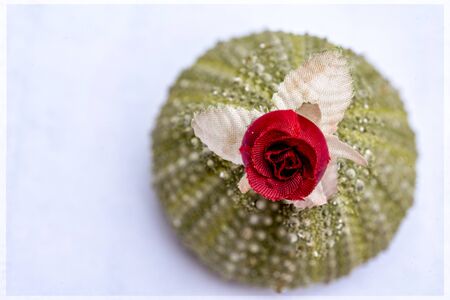 Detailed and detailed structure of a sea urchin with roses on the beach in the sun bright and warm colored decorative and ornamental objects representing summer, fun and holidays, as well as good moments of relaxation and rest