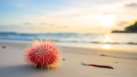 a purple spiky seashell rests on the beach, showcasing a vibrant blend of light red and light cyan colors. this photograph captures the essence of traditional japanese artistic techniques, combined with the beauty of australian landscapes. the exotic atmosphere is enhanced by the soft hues of light red and pink, creating a bokeh panorama that complements the explosive wildlife. ai generated