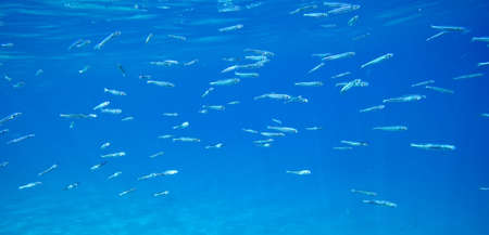 A school of anchovies swimming in the deep blue sea of the Pacific Ocean, Anchovies are commonly used as bait fish for fishermen.