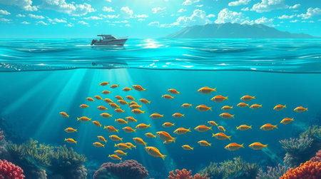 Vibrant aquatic scene featuring a swarm of fish, capturing the dynamic movement and marine life.