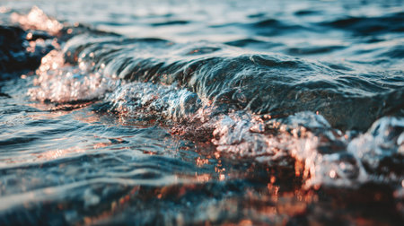 Calm ocean waves gently ripple under the warm sunlight, creating beautiful reflections on the water's surface near a picturesque shoreline. Perfect for summer vibes.