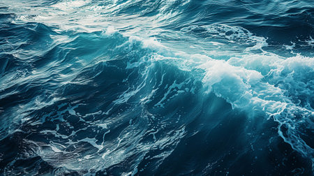 Deep blue ocean water with swirling waves and splashes. Top view of vibrant seascape with sea water