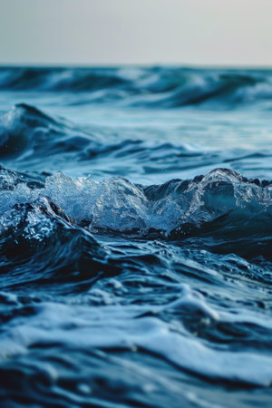 A stunning view of serene ocean waves rolling gently under soft light, depicting the harmonious beauty of nature and the dynamic motion of the sea.