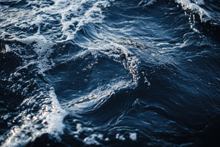 Deep blue ocean water with swirling waves and splashes. Top view of vibrant seascape with sea water