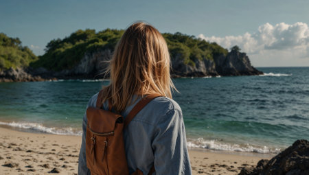 Back view of a young woman with a backpack looking at the sea at sunset