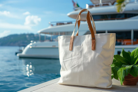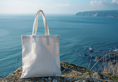 Tote bag mockup. Empty fabric handbag. Shopping bag mock up template on nature seascape scenic. Blank shopper design. Ecological mock-up at sea or ocean