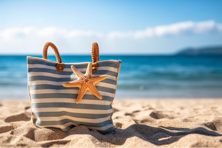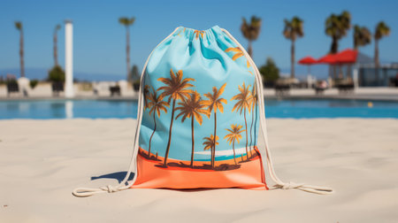A vibrant beach bag adorned with marine-themed decorations rests gracefully on the sandy shore, embracing the essence of a beach getaway. AI Generated