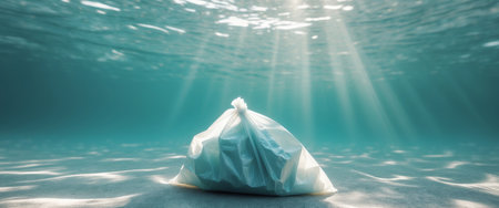 Plastic bag floats in clear ocean water emphasizing marine pollutions environmental impact