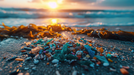 A macro shot of colorful microplastics entangled in seaweed on the beach, symbolizing ocean pollution