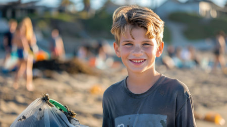 The picture of the caucasian boy and plastic bag with happiness at the beach that has been filled with sand and people, the environmental conservation is required 3R of recycle, reuse, reduce. AIG43.